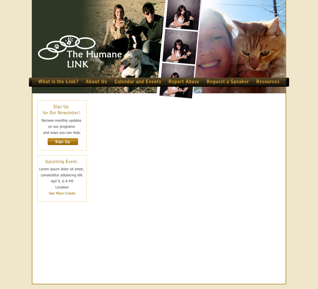 A charity project, I designed a site for a local Humane Society org. Promoting community involvement and positive experiences, we sourced imagery from Facebook users who wanted to submit and promote the site.